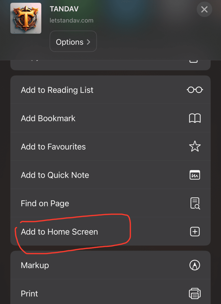 in the menu bar. Scroll down the list of options, then tap Add to Home Screen.